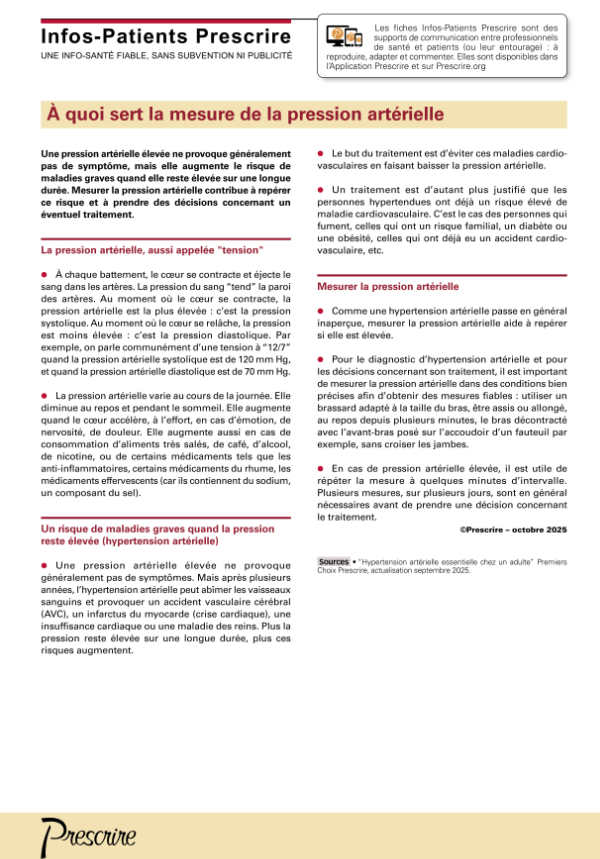 La mesure de la pression artérielle permet d’évaluer le risque de maladies graves et de prendre une décision concernant un traitement éventuel